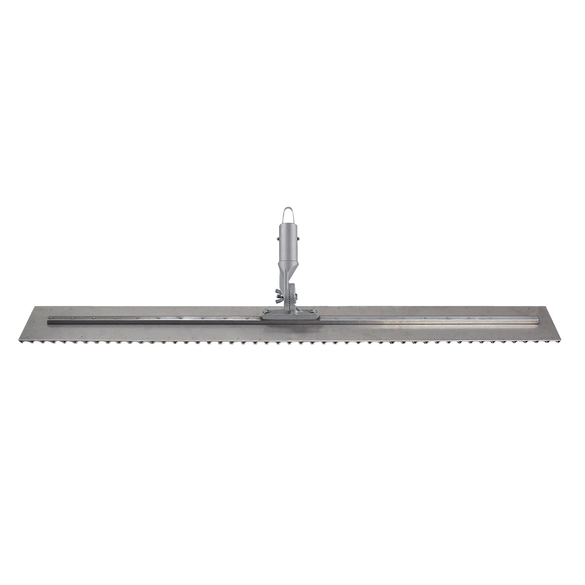 A popular tool to create non-skid surfaces on safety ramps, highways, bridges, and driveways. The Multi-Trac Groover produces a uniform rough groove surface on roads and ramps to keep water flowing off the surface and provide traction. This high quality #18 gauge stainless steel blade ensures an extra smooth working surface for a quality finish. The 5" wide blade moves smoothly through concrete. The 4' long fresno creates 1/4" deep, 1/4" wide grooves 1-1/2" apart on center. These parallel lines provide a safety tread effect on high traffic areas such as ramps, driveways, and sidewalks. The square ends of the fresno allow the user to work against forms and walls for even coverage. A 45" long 1/2" square steel mounting is centered on the 48" blade to help keep the trowel flat. A strong button cast aluminum bracket is attached to the fresno. Uniquely designed bracket has teeth to keep handle at set angle without slippage. Single tilt bracket moves handle 180° for back and forth movements.