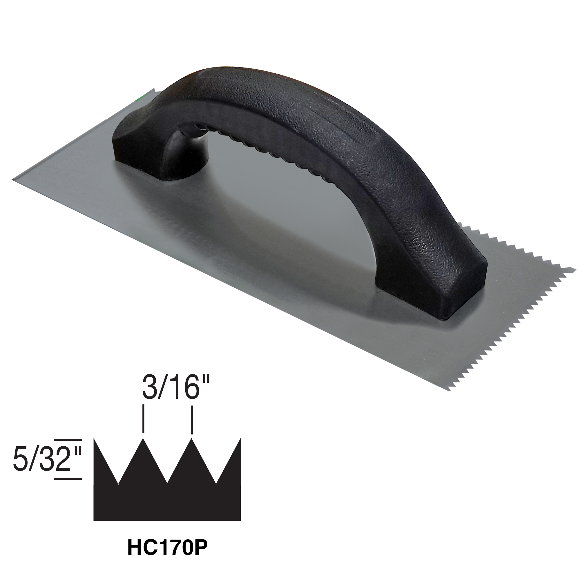 Economy notch trowel to spread adhesives and thinset. The 3/16" x 5/32" sawtooth V-notch is great for spreading thinset for tile, and adhesives for carpet tile, sheet vinyl, vinyl tile, VCT rubber, and popular cork applications. This 9" x 4"steel trowel blade is notched on two sides and straight on two sides. A textured plastic handle provides a comfortable grip.