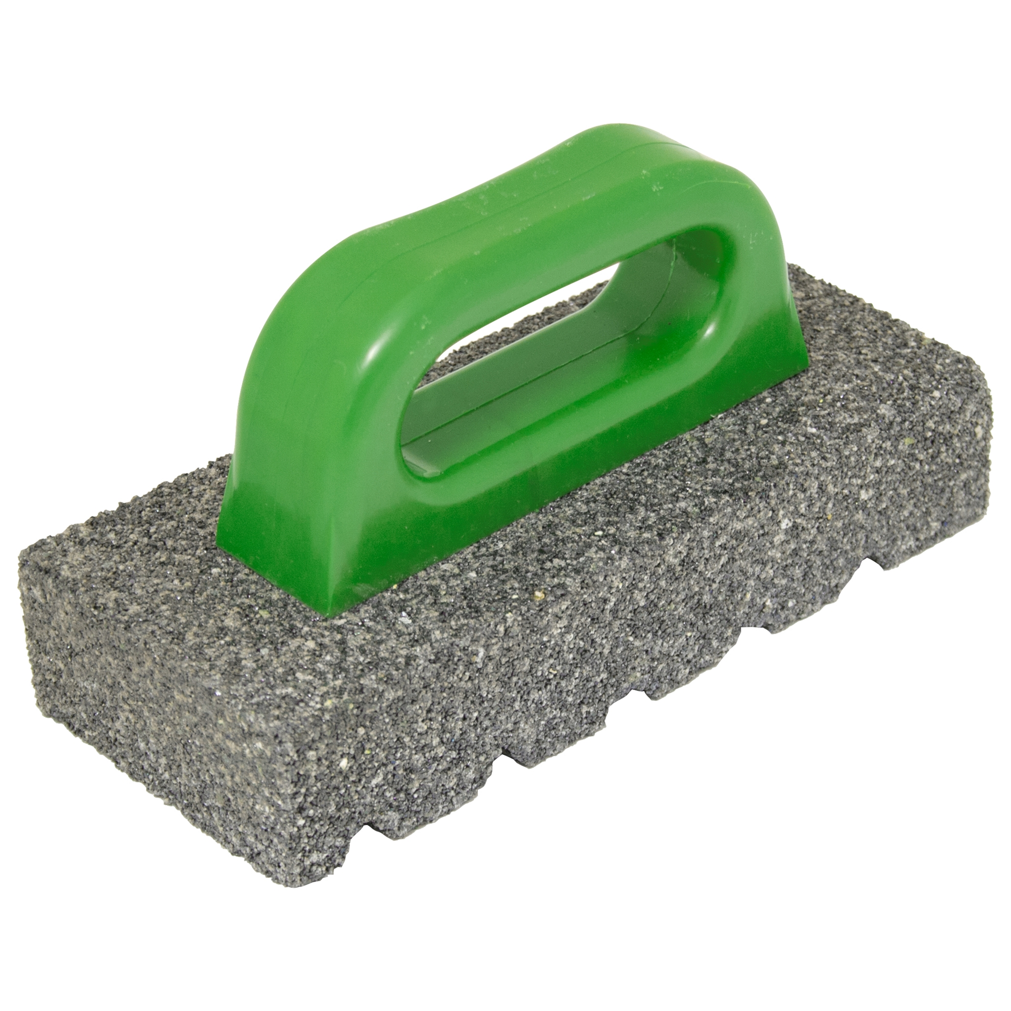 This fluted carbide rub brick makes dressing down concrete fast and easy. The fluted brick is on a diagonal, which provides sharp edges to help with stubborn materials while carrying away the excess debris. Attached to a contoured plastic handle to minimize fatigue. Preferred by finishers for its ease of use. The 1-1/2" thick 20 grit rub brick smooths out concrete to a fine finish. A popular tool to create a smooth professional finish on block walls, wet tile, and concrete, especially excess cement from forms. The favorite tool for decorative concrete prep and applications.